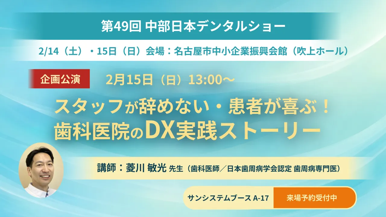 サンシステム株式会社は、2026年2月14日(土)~15日(日)に名古屋市中小企業振興会館(吹上ホール)で開催される 「第49回 中部日本デンタルショー」に出展いたします。